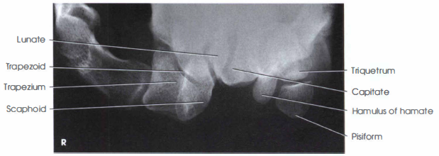 손바닥쪽의 큰마름뼈(trapezium), 손배뼈(scaphoid)의 거친면 손바닥쪽의 작은마름뼈(trapezoid)와 알머리뼈(capitate) 갈고리뼈(hamate)의 갈고리돌기(가장 잘 겹쳐져 나타남)와 콩알뼈(pisiform)로 구성된 손목관(carpal canal)을 관찰할 수 있습니다.