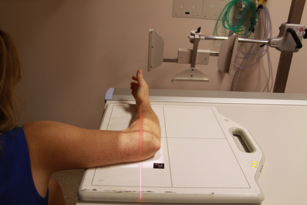 촬영대 끝에 앉게 한 후에 가능하면 팔꿉관절을 펴서 손바닥이 위를 향하게 합니다.