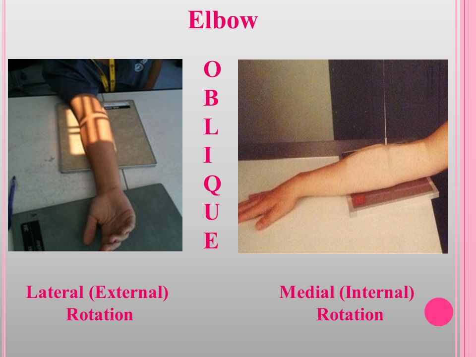 내사방향으로 촬영하면 자뼈의 갈고리돌기(coronoid process)가 잘 관찰되며, 내.외 사방향 촬영의 선택은 관심영역이 갈고리돌기 또는 노뼈머리(radial head)와 노뼈목(radial neck)에 의해 결정합니다.