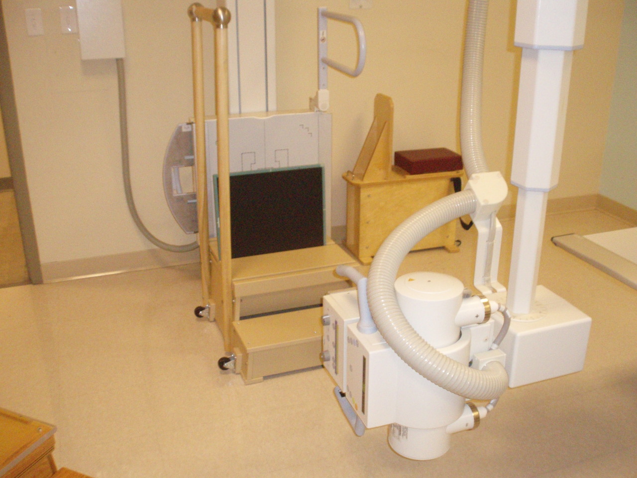 발판 위에 나무상자를 놓고 서게 하거나 상수용체(IR)를 세워서 넣을 수 있는 구멍이 뚫린 촬영대 위에 서게 한 후, 환자가 안전하게 지지를 유지하기 위해 지지물을 이용하며, 생식샘 부위를 차폐물로 보호합니다.
