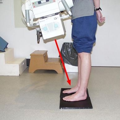 선 자세에서 발바닥 세로활의 구조적 상태를 보기 위해발을 구성하고 있는 뼈의 측방향 촬영상을 관찰할 수 있다.(비교하기 위해 양쪽 발을 촬영한다.)